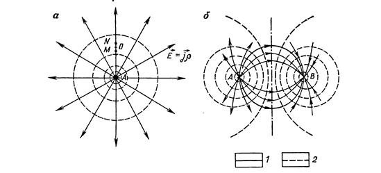 Рис. 1. Поля одного (а) и двух (б) точечных электродов в однородной изотропной среде: 1 – линии тока; 2 – линии равных потенциалов
