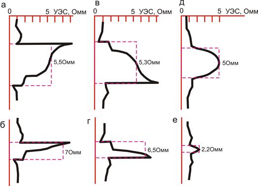 Рис. 4. Кривые ρк при пересечении пластов высокого сопротивления (dc = 0). а, б – кровельный градиент-зонд; в, г – последовательный градиент-зонд; д, е – потенциал-зонд; Пунктирная линия – кровля, подошва пласта и снятое значение ρк.