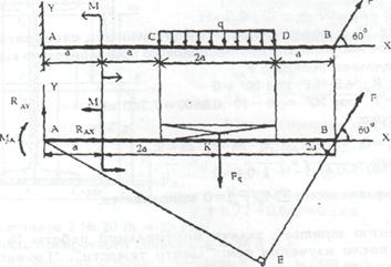 Задание Для консольной балки, нагруженной равномерно распределенной нагрузкой интенсивностью q, силой F и парой сил с моментом М, определить опорные реакции заделки, если q = 20 кН/м, F= 10 кН, М =5 кН м, а = 0,4 м. Решение 1.Выбираем систему координат хАу, совмещая ось х с балкой, а ось у, направляя перпендикулярно оси х. Освобождаем балку от связей и прикладываем реакции связей: реактивный момент МА и составляющие реакции RA по осям координат RAX и RAY. Равнодействующую равномерно распределенной нагрузки Fq = q · 2а = 20 · 2 ·0,4 = 16 кН, приложенную в точке пересечения диагоналей прямоугольника, переносим по линии ее действия в середину участка CD — в точку К. 2. Для полученной плоской системы сил составляем 3 уравнения 2.1 Определяем реактивный момент МA ∑МA(FK)=0: MA-M + Fq 3a-F · AE=0. Определяем плечо силы F относительно точки А. Для того из точки А опускаем перпендикуляр АЕ на линию действия силы F. Из ∆ ABE определяем плечо силы F: АЕ=АВ · sin60°=5а sin60°=5 · 4 · 0.8560=1.732 м 2.2 Определяем реакцию rax ΣFAX=0; rAX +F ·cos60° =0; RAX=-F · cos60° = -10 ·0.5 кН. Реакция RAX получилась отрицательной, следовательно, ее действительное направление противоположно предварительно выбранному. 2.3 Определяем реакцию RAY: ΣFXY =0; RAY –F + F · cos30° =0 RAY=Fq-F · cos30° =16-10 · 0,8660 = 7,340 кН. 3. Проверка: ΣMB (FK) = 0; MA+RAY · 5a - M-Fq · 2a = 0; 3,120 + 7,340 · 5 ·0,4 -5-16 ·2 ·0,4=0 Условие равновесия ΣMB (FK)= 0 выполняется. К решению третьей задачи контрольной работы № 1 нужно приступить после изучения тем: "Центр тяжести", "Геометрические характеристики плоских сечений". При определении координат центра тяжести площади сложного сечения следует помнить, что центр тяжести прямоугольника располагается в точке пересечения его диагоналей, а координаты центра тяжести прокатных профилей необходимо определять с помощью таблиц сортаментов, в которых указаны размеры и координаты центра тяжести двутавров, швеллеров и уголков. При расчете на прочность и жесткость деталей, испытывающих кручение и изгиб, а также в расчетах на устойчивость сжатых стержней фигурируют некоторые характеристики, определяющие способность тела сопротивляться деформированию. Такими характеристиками, значения которых зависят от размеров и формы тела, являются моменты инерции сечений. В предлагаемых задачах также требуется определить главные центральные моменты инерции, то есть осевые моменты инерции сечения относительно его главных центральных осей. Напоминаем, что в сечении с двумя осями симметрии эти оси и являются главными центральными; в сечении с одной осью симметрии вторая главная центральная ось проходит через центр тяжести сечения перпендикулярно первой.