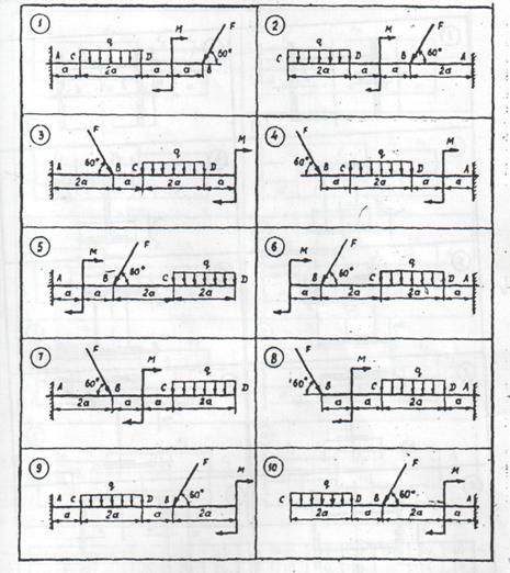 Задание 2 Для консольной балки, нагруженной равномерно распределенной нагрузкой интенсивностью q, силой F и парой сил с моментом М, определить опорные реакции заделки. Силой тяжести балки пренебречь.