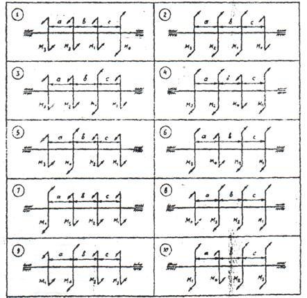 Задание 5 Для стального вала круглого поперечного сечения определить значения внешних скручивающих моментов М1, М2 и М3соответствующие передаваемым мощностям Р1, Р2 и Р3, и уравновешивающий момент М0. Построить эпюру крутящих моментов по длине вала. Призаданных значениях допускаемого напряжения на кручение [τ] =30 Н/мм2 и допускаемого относительного угла закручивания [φ]=0,02 рад/м. Определить диаметры вала из расчетов на прочность и жесткость; принимаемое значение диаметра вала округлить до ближайшего четного или оканчивающегося на 5 числа. Построить эпюру углов закручивания по длине вала, приняв модуль сдвига G = 8 * 10 Н/мм2. Угловая скорость вала ω = 25 рад/с.