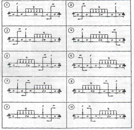Задание 6 Для двухопорной балки, нагруженной равномерно распределенной нагрузкой интенсивностью q, силой F и парой сил с моментом М, определить реакции опор, построить эпюры поперечных сил и изгибающих моментов. Найти максимальный изгибающий момент и, исходя из условия прочности, подобрать необходимые размеры "b" и "h" деревянной балки прямоугольного поперечного сечения, приняв h = 2b и [σ] =10 Н/мм2.