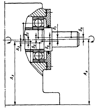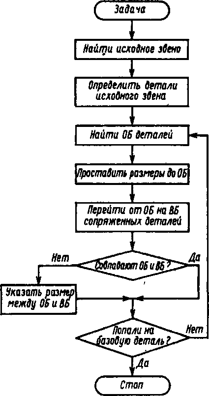 Рис. 2.2. Схема неформального алгоритма построения размерной цепи В ряде случаев силовые параметры качества изделия достигаются через размерные. Так, например, момент холостого хода вала редуктора зависит от натяга подшипников, который регулируется при сборке установкой прокладки соответствующей толщины. Нормальное давление запрессованных деталей зависит от натяга, т.е. разности диаметров вала и втулки. Таким образом, получение изделия требуемого качества при сборке во многом определяется достижением требуемых размеров: установочных размеров между основными и вспомогательными базами соединяемых при сборке деталей, а также размеров, характеризующих положение и движение исполнительных поверхностей изделия. Размеры, характеризующие положение и движение ИП машины, принимаются в качестве исходных звеньев конструкторских размерных цепей при размерном анализе конструкции и образуются как замыкающие звенья размерных цепей в результате изготовления машины или сборочной единицы. Размерный анализ конструкции включает три основных этапа: выявление структуры размерной связи построением размерной цепи; выбор метода достижения точности исходного звена; определение параметров всех составляющих звеньев. Конструкторские размерные цепи строят по известной методике (рис. 2.2) для каждого размерного параметра положения и движения исполнительных поверхностей машины, которые принимают в качестве исходных звеньев. Для этого от поверхностей или осей, ограничивающих замыкающее звено, проставляют размеры до основных баз ОБ деталей, которым принадлежат исполнительные поверхности машины. Далее переходят на вспомогательные базы ВБ сопряженных деталей и проставляют очередные размеры до основных баз этих деталей. Так продвигаются по обе стороны от исходного звена, пока не приходят на одну и ту же базовую деталь. Несовпадения основных и вспомогательных баз сопряженных деталей учитывают отдельным размером, что особенно важно для последующего обоснования требований к точности монтажа деталей при сборке. В результате этого этапа получают конструкторские размерные цепи. В качестве примера на рис. 2.3 показаны конструкторские размерные цепи, характеризующие требуемое положение и точность вращения выходного вала редуктора (см. рис. 2.1). Составляющими звеньями размерных цепей являются размеры составляющих деталей А3, Б1, а также установочные размеры установки А2, Б2 деталей, т.е. размеры несовпадения основных и вспомогательных баз соединяющихся деталей, в данном случае отклонение Б2 от соосности шейки вала с внутренним кольцом шарикоподшипника и отклонение А2 от соосности наружного кольца подшипника с отверстием в корпусе. Следующим этапом анализа является выбор метода дости жения точности исходного звена с учетом возможностей его реализации в автоматическом режиме. Последний этап состоит в расчете допусков составляющих звеньев и координат середин полей допусков. Номинальные размеры составляющих звеньев определяют заранее исходя из расчетов, деталей машин на прочность, жесткость и т.д. по соответствующим формулам при проектировании конструкции изделия. Практически два последних этапа выполняются параллельно. Оптимальное решение прямой задачи распределения допусков по составляющим звеньям осуществляется таким образом, что
