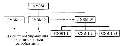 По указанной причине управление в АСУТП организуется по иерархическому принципу. Иерархическое управление является одной из разновидностей централизованного управления. При управлении по иерархическому принципу система управления подразделяется на отдельные уровни, или ранги. Общее управление осуществляется центральной управляющей вычислительной машиной (ЦУВМ), которая считается УВМ высшего (первого) ранга. Однако ЦУВМ при иерархическом управлении управляет ТО не непосредственно, а только через промежуточные, локальные, управляющие вычислительные машины (ЛУВМ). Все ЛУВМ, управляемые непосредственно от ЦУВМ, называются УВМ второго ранга (второго уровня управления). Если имеются ЛУВМ, управляемые не от ЦУВМ, а от УВМ второго ранга, то такие ЛУВМ называются ЛУВМ третьего ранга. По отношению к ним соответствующая УВМ второго ранга оказывается центральной. В результате при управлении по иерархическому принципу каждая УВМ управляет лишь управляющими устройствами ближайшего низшего ранга, а подчиняется лишь одной из УВМ ближайшего высшего ранга. Исключение составляет самый нижний уровень управления, на котором осуществляется непосредственное управление ТО, т.е. не управляющими, а исполнительными устройствами. Для АСУТП типична трехуровневая иерархическая структура, представленная на рис. 1.1. Здесь ЦУВМ, которая является достаточно мощным промышленным компьютером, снабжает управляющими программами TV ЛУВМ, а последние управляют исполнительными электроприводами (например, М электроприводов)