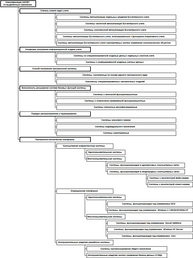 Рисунок 4.2. Классификация АИСБУ по выделенным признакам Данная классификацияхарактеризует состав учетных задач, решаемых системой. В соответствии с данной классификацией программные средства АИСБУ подразделяются на: - системы автоматизации отдельных разделов бухгалтерского учета; - системы частичной автоматизации бухгалтерского учета; - системы комплексной автоматизации бухгалтерского учета; - системы автоматизации бухгалтерского учета, интегрированные с функциями оперативного учета; - системы автоматизации бухгалтерского учета корпоративных систем управления экономическим объектом. Системы автоматизации отдельных разделов бухгалтерского учета. Такие системы были характерны для начального этапа компьютеризации учета, но и сейчас некоторые из фирм предлагают программные продукты автоматизации локальных разделов учета: - складского учета; - учета основных средств; - учета труда и заработной платы и др. Такие программы находят спрос и часто используются совместно с другими, прежде всего с системами сводного учета. Их разработчики включают в них специальные инструменты, позволяющие экспортировать данные в другие учетные программы для дальнейшей обработки. Например, программа «База данных по учету ОС» [1] предназначена для решения задач оперативного учета ОС. Она позволяет формировать проводки для их передачи и последующей обработки в других программах, как например «1С: Бухгалтерия». Системы частичной автоматизации бухгалтерского учета ориентированы в основном на реализацию сводного стоимостного учета на основе бухгалтерских проводок и несложного аналитического учета. Они позволяют организовать завершенную технологию автоматизированного ведения бухгалтерского учета от первичного документа до получения стандартной отчетности. Однако отсутствие функций количественного учета не позволяет полноценно автоматизировать целый ряд расчетов, требующих натуральных показателей, таких как оценка себестоимости отпущенных в производство материалов и выпущенной продукции, расчет износа и переоценка основных средств. В качестве примера можно отметить программу «Система бухгалтерского учета на базе MS Excel» [1]. Она позволяет вводить проводки, получать журнал хозяйственных операций, оборотные ведомости, главную книгу и т.д. С ее помощью можно вести несложный аналитический учет. Однако отсутствие функций натурального учета не позволяет в полной мере решать задачи учета товарно-материальных ценностей, калькуляции себестоимости, учета основных средств и нематериальных активов. Не поддерживаются здесь и функции учета труда и заработной платы. Для решения этих задач следует использовать другие программы. Системы комплексной автоматизации бухгалтерского учета потенциально способны решать любые задачи по всем разделам бухгалтерского учета. Однако это не означает, что в них изначально реализована возможность решения всех задач бухгалтерского учета без исключения. Часто для решения задач конкретного предприятия эти системы нуждаются в дополнительной настройке. Например, с помощью профессиональной версии программ «1С: Бухгалтерия 7.7» потенциально можно решать любые задачи бухгалтерского учета. Однако ее типовая конфигурация, входящая в комплект поставки, определяет некоторую обобщенную модель бухгалтерско