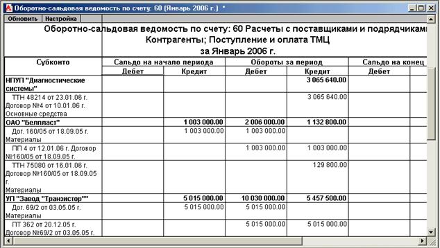 Рисунок 7.12. Представление формы оборотно-сальдовой ведомости счета 60 «Расчеты с поставщиками и подрядчиками» в разрезе аналитических счетов в программе «1С: Бухгалтерия 7.7»