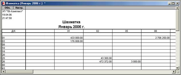 Рисунок 7.13. Фрагмент представления шахматной ведомости в программе «1С: Бухгалтерия 7.7»