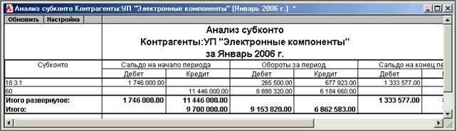 Рисунок 7.15. Фрагмент представления отчета «Анализ субконто» в программе «1С: Бухгалтерия 7.7»