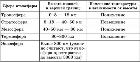 Атмосфера – воздушная оболочка, окружающая земной шар, связанная с ним силой тяжести и принимающая участие в его суточном и годовом вращении. Атмосферный воздух состоит из механической смеси газов, водяного пара и примесей. Состав воздуха до высоты 100 км – 78,09% азота, 20,95% кислорода, 0,93% аргона, 0,03% углекислого газа, и всего лишь 0,01% приходится на долю всех остальных газов: водорода, гелия, водяного пара, озона. Газы, составляющие воздух, все время перемешиваются. Процентное соотношение количества газов довольно постоянно. Однако содержание углекислого газа изменяется. Сжигание нефти, газа, угля, уменьшение количества лесов приводит к увеличению содержания углекислого газа в атмосфере. Это вносит свой вклад в повышение температуры воздуха на Земле, т. к. углекислый газ пропускает солнечную энергию к Земле, а тепловое излучение Земли задерживает. Таким образом, углекислый газ является своеобразным «утеплителем» Земли. Озона в атмосфере мало. На высоте 25—35 км наблюдается концентрация этого газа, так называемый озоновый экран (слой озона). Озоновый экран выполняет важнейшую функцию защиты – задерживает ультрафиолетовое излучение Солнца, губительное для всего живого на Земле. Атмосферная вода находится в воздухе в виде водяного пара или взвешенных продуктов конденсации (капель, ледяных кристаллов). Атмосферные примеси (аэрозоли) – жидкие и твердые частички, находящиеся преимущественно в нижних слоях атмосферы: пыль, вулканический пепел, сажа, кристаллики льда и морской соли и т. п. Количество атмосферных примесей в воздухе увеличивается во время сильных лесных пожаров, пыльных бурь, извержений вулканов. Подстилающая поверхность также влияет на количество и качество находящихся в воздухе атмосферных примесей. Так, над пустынями много пыли, над городами много мелких твердых частиц, сажи. Наличие примесей в воздухе связано с содержанием в нем водяного пара, т. к. пыль, кристаллики льда и другие частички служат ядрами, вокруг которых конденсируется водяной пар. Как и углекислый газ, водяной пар атмосферы служит «утеплителем» Земли: он задерживает излучение с земной поверхности. Масса атмосферы составляет одну миллионную долю массы земного шара. Строение атмосферы. Атмосфера имеет слоистое строение. Слои атмосферы выделяются на основе изменения температуры воздуха с высотой и по другим физическим свойствам (таблица 1) Таблица 1. Строение атмосферы и верхней границ Изменение температуры Сфера атмосферы Высота нижней в зависимости от высоты