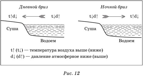 Внутри главных (зональных) типов ВМ существуют подтипы – континентальные (формирующиеся над материком) и океанические (формирующиеся над океаном). Для воздушной массы характерно общее направление перемещения, но внутри этого объема воздуха могут быть разные ветры. Свойства воздушных масс изменяются. Так, морские умеренные воздушные массы, переносимые западными ветрами на территорию Евразии, при движении на восток постепенно прогреваются (или охлаждаются), теряют влагу и превращаются в континентальный умеренный воздух. Климатообразующие факторы: 1) географическая широта места, т. к. от нее зависит угол наклона солнечных лучей, а значит количество тепла; 2) циркуляция атмосферы – преобладающие ветры приносят определенные воздушные массы; 3) океанические течения (см. об атмосферных осадках); 4) абсолютная высота места (с высотой температура понижается); 5) удаленность от океана – на побережьях, как правило, менее резкие перепады температур (дня и ночи, сезонов года); больше осадков; 6) рельеф (горные хребты могут задерживать воздушные массы: если влажная воздушная масса встречает на своем пути горы, она поднимается, охлаждается, влага конденсируется и выпадают осадки). Климатические пояса меняются от экватора к полюсам, т. к. изменяется угол падения солнечных лучей. Это в свою очередь определяет закон зональности, т. е. изменение компонентов природы от экватора к полюсам. Внутри климатических поясов выделяют климатические области – часть климатического пояса, обладающая определенным типом климата. Климатические области возникают вследствие влияния действия различных климатообразующих факторов (особенностей циркуляции атмосферы, влияния океанических течений и т. п.). Например, в умеренном климатическом поясе Северного полушария выделяют области континентального, умеренно континентального, морского и муссонного климатов. Общая циркуляция атмосферы – система воздушных течений на земном шаре, которая способствует переносу тепла и влаги из одних районов в другие. Воздух перемещается из областей высокого давления в области низкого. Области высокого и низкого давления формируются в результате неравномерного нагревания земной поверхности. Под влиянием вращения Земли потоки воздуха отклоняются в Северном полушарии вправо, в Южном – влево. В экваториальных широтах благодаря высоким температурам постоянно существует пояс низкого давления со слабыми ветрами. Нагретый воздух поднимается вверх и растекается на высоте к северу и югу. При высоких температурах и восходящем движении воздуха, при большой влажности образуется большая облачность. Здесь выпадает большое количество осадков. Примерно между 25 и 30° с. и ю. ш. воздух опускается к поверхности Земли, где вследствие этого формируются пояса высокого давления. Около Земли этот воздух направляется в сторону экватора (где низкое давление), отклоняясь в Северном полушарии вправо, в Южном – влево. Так образуются пассаты. В центральной части поясов высокого давления зона затишья: ветры слабые. Благодаря нисходящим токам воздуха происходит иссушение и прогревание воздуха. Жаркие и сухие районы Земли расположены в этих поясах. В умеренных широтах с центрами около 60° с. и ю. ш. давление низкое. Воздух поднимается вверх и устремляется затем в полярные районы. В умеренных широтах пре