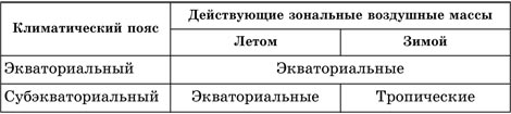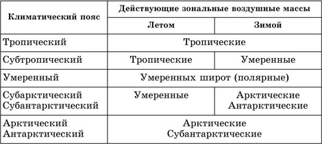 Теплый фронт образуется при активном движении теплого воздуха в сторону холодного. Тогда теплый воздух натекает на отступающий клин холодного и поднимается по плоскости раздела. При подъеме он охлаждается. Это приводит к конденсации водяного пара, возникновению перистых и слоисто-дождевых облаков и выпадению осадков. С приходом теплого фронта атмосферное давление понижается, с ним, как правило, связано потепление и выпадение обложных, моросящих осадков. Холодный фронт образуется при перемещении холодного воздуха в сторону теплого. Холодный воздух, как более тяжелый, подтекает под теплый и подталкивает его вверх. При этом возникают слоисто-кучевые дождевые облака, из которых выпадают осадки в виде ливней со шквалами и грозами. С прохождением холодного фронта связано похолодание, усиление ветра и увеличение прозрачности воздуха. Большое значение имеют прогнозы погоды. Прогнозы погоды делают на разное время. Обычно погоду предсказывают на 24—48 ч. Составление долгосрочных прогнозов погоды связано с большими трудностями. Климат – характерный для данной местности многолетний режим погоды. Климат влияет на формирование почвы, растительности, животного мира; определяет режим рек, озер, болот, оказывает влияние на жизнь морей и океанов, формирование рельефа. Распределение климата на Земле зонально. На земном шаре выделяют несколько климатических поясов. Климатические пояса – широтные полосы земной поверхности, которые обладают однородным режимом температур воздуха, обусловленным «нормами» прихода солнечной радиации и формированием однотипных воздушных масс с особенностями их сезонной циркуляции (таблица 2). Воздушные массы – большие объемы воздуха тропосферы, обладающие более или менее одинаковыми свойствами (температура, влажность, запыленность и т. п.). Свойства воздушных масс определяются территорией или акваторией, над которой они формируются. Характеристики зональных воздушных масс: экваториальные – теплые и влажные; тропические – теплые, сухие; умеренные – менее теплые, более влажные, чем тропические, характерны сезонные различия арктические и антарктические – холодные и сухие. Таблица 2. Климатические пояса и действующие в них воздушные массы