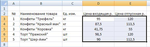При работе с таблицами очень часто приходится выделять блоки смежных ячеек, чтобы применить к ним некоторую настройку. Например, чтобы в нашей таблице выровнять значения столбцов Цена входящая и Цена отпускная по центру, необходимо сначала выделить блок с цифрами, ячейки которого являются смежными (рис. 4 а). Это можно осуществить следующим образом: подвести указатель к угловой ячейке выделяемого диапазона, например D3, нажать левую кнопку мыши и, удерживая ее нажатой, перетащить указатель к диагонально противоположной ячейке блока Е7. Теперь, когда блок ячеек выделен, чтобы отцентрировать значения, следует в группе команд Выравнивание на вкладке Главная нажать кнопку По центру.