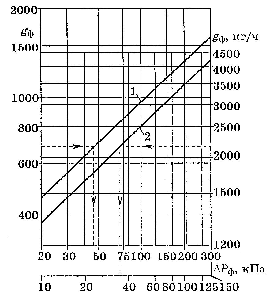 Рис. 5.1 - Расходные характеристики форсунок ЭШФ 7/10 (1) и УЦ14- 10/15 (2) Для адиабатного процесса расчет камеры орошения проводится по формулам (5.7), (5.8), (5.14), (5.15) определяются значения ЕА, μ, Mw, gф, Δрф. Аэродинамическое сопротивление камеры орошения ОКФ-3 Δрор ≤160 Па, камеры орошения ОКС-3 Δрор ≤ 160 Па.