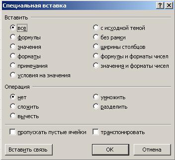 Иногда довольно удобно применять к скопированным в буфер обмена данным операции сложения, умножения и т.п. В этих случаях используется команда Специальная вставка, вызываемая из контекстного меню. В приведенной на рис. 6 таблице требуется добавить значения столбца 3-я бригада к значениям столбца Заготовка яблок, т. Для этого необходимо сделать следующее: 1. Скопировать значения диапазона D2:D5 в буфер обмена. 2. Установить курсор в ячейку В2 - первую ячейку области вставки и, выполнив щелчок правой кнопкой мыши по этой ячейке, вызвать контекстное меню, в котором выбрать команду Специальная вставка. 3. В открывшемся одноименном диалоговом окне (рис. 7) в поле Операция выбрать пункт сложить. 4. Нажать кнопку ОК.