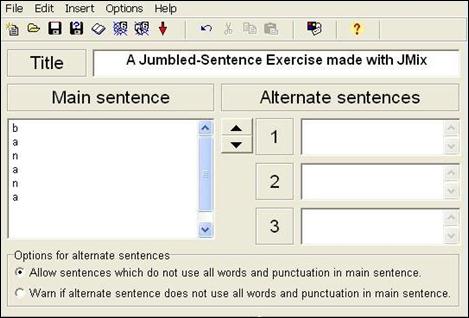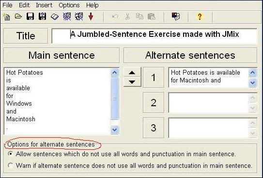 Поле «Alternate sentences» (Варианты ответов) заполняется для предложений, в которых возможны различные варианты порядка слов. Для них в рабочем окне устанавливаются дополнительные настройки (Options for alternate sentences):