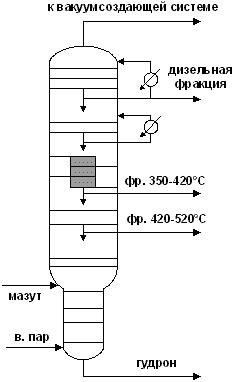 В процессах вакуумной перегонки мазута по топливному варианту преимущественно используют схему однократного испарения, применяя одну сложную ректификационную колонну с выводом дистиллятных фракций через отпарные колонны или без них. При использовании отпарных колонн по высоте основной вакуумной колонны организуют несколько циркуляционных орошений.