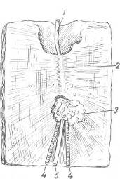 Рис. 22. Пупочная фасция почный канал, который ограничен (Richard). спереди задней поверхностью бе- 1 — пупочная вена; 2 — пупочная фасция; 3 — сальник ущемленный в пупочном отверстии; 4 — пупочная артерия; 5 — мочевой проток Со стороны брюшной полости в области пупка хорошо видны четыре соединительнотканных тяжа: заросшая пупочная вена, прилегающая к верхнему краю пупочного кольца, две заросшие пупочные артерии и заросший мочевой проток (urachus), прилегающие к нижнему краю пупочного кольца и срастающиеся с кожным пупочным рубцом. Между пупочной фасцией и белой линией живота располагается пупупочный канал, который отграничен спереди задней поверхностью белой линии живота, срединными краями прямых мышц живота, сзади передней поверхностью пупочной фасции. Передняя стенка пупочного канала имеет ширину до 3 см. Таким образом, в пупочном канале имеются две стенки — передняя и задняя, два отверстия — верхнее и нижнее, из которых первое чаще бывает облитерировано (рис. 23). По А. А. Дешину, в 27% случаев имеется пупочный канал без наличия пупочной грыжи. Грыжевое выпячивание, проходящее по этому каналу, определяется как пупочная косая грыжа. При прогрессирующей слабости брюшной стенки, при избыточном отложении жировой ткани стираются ранее выраженные анатомические границы и пупочный канал расширяется, превращаясь в типичное грыжевое кольцо прямого направления, определяя тем самым название грыжевого выпячивания — «прямая пупочная грыжа». Наблюдаются также случаи внезапного развития пупочных грыж, ранее не выявлявшихся, что объясняется наличием