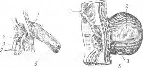 Рис. 23. Брюшная стенка развивающегося плода и образование эмбриональных и пуповинных грыж (Patten). а: 1 — пупочная вена; 2 — «слабое место»; 3 — мочевой проток; 4 — мочевой пузырь; 5 — пупочные артерии. 6:1 — грыжа; 2 — пупочные артерии; 3 — мочевой пузырь; 4 — мочевой проток. в: 1 — пупочная вена; 2 — грыжа; 3 — пупок. пупочного канала. Для практической работы вполне целесообразно подразделить пупочные грыжи на следующие виды: 1) пупочные эмбриональные грыжи и грыжи пупочного канатика (пуповинные); 2) грыжи новорожденных; 3) грыжи детского возраста; 4) грыжи взрослых. Каждый из этих видов пупочных грыж имеет свои анатомические особенности, клинику и показания к оперативному лечению. В настоящее время показания к оперативному лечению эмбриональных и пуповинных грыж расширяются в связи с накопившимся опытом и большим вниманием к хирургии новорожденных.