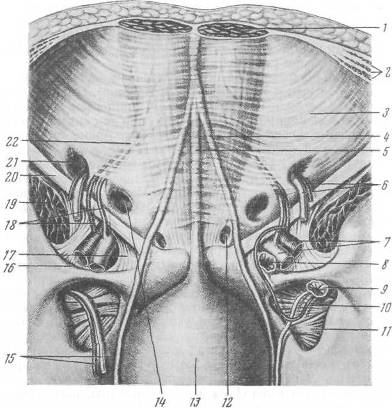 Рис. 42. Складки и ямки по задней поверхности передней брюшной стенки по Киршнеру с изменениями (Г. Е. Островерхое, Д. Н. Лубоцкий, Ю. М. Бомаш). 1 — прямая мышца живота; 2 — косые и поперечная мышщ.1 живота; 3 — пристеночная брюшина передней брюшной стенки; 4 — plica umbilicalis media (no BNA-lateralis): 5 — plica umbilicalis mediana (по BNA - media); 6 — ductus deferens и a. testicularis; 7 — а. и v. iliaca exteraa: 8 — бедренная грыжа (грыжевой мешок); 9 — запирательная грыжа (грыжевой мешок); 10 — a. obturatoria, возникшая из a. epigastrica inferior: 11 — membrana obturatoria; 12 — fossa supravesicalis; 13 — мочевой пузырь; 14 — fossa inguinalis medialis; 15 — a. obturatoria и n. obturatorius; 16 — гребень лонной кости; 17 — lig. lacunare; 18 — vasa epigastrica inferiora; 19 —m. iliopsoas; 20 — паховая связка; 21 —fossa inguinalis lateralis; 22 — plica umbilicalis lateralis (по BKA — epigastrica). Практическое значение пахового канала определяется прохождением через него различных паховых грыж. В паховом канале различают четыре стенки: переднюю, образованную апоневрозом наружной косой мышцы; заднюю, образованную поперечной фасцией; верхнюю, образованную нижними краями внутренней косой и поперечной мышц; нижнюю, образованную желобом паховой связки. Анатомическими границами области, в которой располагается паховый канал, являются: сверху — горизонтальная линия, начинающаяся от границы между наружной и средней третями паховой связки, снизу — паховая связка и с внутренней стороны — наружный край прямой мышцы. По своему протяжению паховый канал проходит от внутреннего до поверхностного пахового кольца. Длина пахового канала у взрослых в среднем равна 4,5 см. У детей паховый канал прямее, шире и короче. У женщин паховый канал уже, чем у мужчин. По протяжению пахового канала проходят семенной канатик и круглая связка матки. Элементы семенного канатика окружены рыхлой клетчаткой и расположены в одной общей с яичком оболочке (tunica vaginalis communis). К этой оболочке прилегают мышца, поднимающая яичко (m. cremaster) и п. spermaticus externus. Кровоснабжение яичка, придатка и семенного канатика, а также их оболочек обеспечивается тремя артериями: внутренней семенной (a. spermatica interna), наружной семенной (a. spermatica externa) и артерией семявыносящего протока (a. deferentialis). Вены семенного канатика составляют венозное сплетение (plexus pampiniformis) и впадают справа в нижнюю полую вену, а слева — в почечную вену. И. Ф. Шишов (1937) установил, что артерии яичка и придатка (a. spermatica interna и a. deferentialis) неавтономны и широко анастомозируют между собой; анастомозирующая с ними a. spermatica externa питает в основном оболочки яичка; случайная или вынужденная перевязка a. spermatica interna при грыжесечении или операции по поводу расширения вен семенного канатика не может вызвать некроза или атрофии яичка. И. А. Солдатченков (1938) пришел к заключению, что яичко питается преимущественно через внутреннюю семенную артерию, которая не является конечной. Артерия семявыносящего протока не может заменить внутреннюю семенную артерию при выключении ее из питания яичка. В паховой области расположены n. ilioinguinalis, n. iliohypogastricus. Последний проходит в толще передней брюшной стенки выше spina ossis ilii anterior superior и далее между m. obli-quus internus и m. transversus. Первый располагается ниже и выходит через поверхностное паховое кольцо.