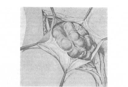 Рис. 64. Скользящая грыжа слепой кишки (A. Fischer, E. Gohrbandt, F. Sauerbruch).