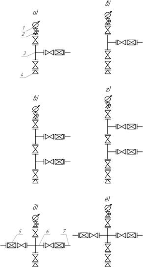 1 - манометр; 2 - запірний прис-трій до маномет- ра; 3 - трійник; 4 - перехідник до трубної головки; 5 - дросель; 6 - хрестовик; 7 - відвідний фланець