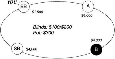 Ситуация: Онлайновый турнир по схеме «сит-эн-гоу». Призовые в турнире делятся среди трех лучших игроков в стандартном соотношении: 50% за первое место, 30% за второе и 20% за третье. В игре остались четверо. В отличие от предыдущей задачи, теперь вы единственный игрок в турнире с мелким стеком. Ваша рука:?? Игра до вас: Как и ранее, игрок А делает ставку олл-ин, а игрок В и игрок на позиции малого блайнда сбрасывают. Вы считаете, что игрок А руководствуется таким же списком рук для хода олл-ин, как и раньше: любая пара, любая рука с тузом, король-валет или выше, как одномастные, так и разномастные, и дама-валет, одномастные или разномастные. Ваша рука:?? Вопрос 41: Какое из эти утверждений верно? A. Уравнивайте с руками от AA до 99, и с AK и AQ, одномастными или разномастными B. Уравнивайте с руками от AA до 66, и от AK до AT одномастными, и с руками от AK до AJ разномастными C. Уравнивайте с любой парой и с руками от AK до A8, одномастными или разномастными, и с KQ, KJ, QJ одномастными или разномастными D. Уравнивайте с любой парой, с любой рукой с тузом, и с любыми двумя картами выше десятки Решение Задачи № 41 Теперь мы изменили размеры стеков так, чтобы вы были единственным игроком с мелким стеком со значением М равным 5, тогда как три других игрока все имеют крупные стеки и значения М чуть выше 13. Вы не просто в опасности, ситуация осложнена тем, что нет других игроков в столь же опасном положении. Как сильно это повлияет на ваши требование к силе руки для колла? Еще раз повторим, что ваше ухудшившееся положение позволяет вам понизить требования к силе руки, но лишь на немного. Правильный ответ здесь – это вариант В "Уравнивайте с руками от AA до 66, и от AK до AT одномастными, и с руками от AK до AJ разномастными". Запишите 3 очка за вариант B и по 1 очку за каждый вариантов A и C. Если бы вы считали, что игрок A использует тайтовые требования к силе рук для хода олл-ин (восьмерки или выше, туз-десятка или выше, король-дама), тогда ваше требования к силе руки для колла снова станут очень жесткими. Вы сможете делать колл только с валетами или выше плюс с рукой туз-король одномастные или разномастные. Жизнь в ситуация «пузыря» нелегка! Задача № 42