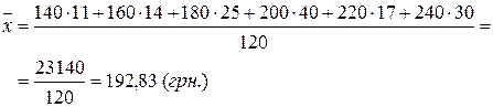 Средняя зарплата на данном предприятии 192,83 грн. Выборки, имеющие одинаковые средние могут значительно отличаться друг от друга по степени разброса (вариации). Для оценки вариации применяется дисперсия: