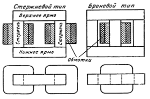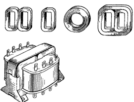 Ленточные сердечники разрезаются на две половины, чтобы можно было надеть на них катушки. Затем половины сердечника стягиваются и закрепляются. Обмотка трансформаторов выполняется из изолированной круглой или прямоугольной меди. На стержень магнитопровода предварительно надевают изолирующий (обычно картонный, пропитанный бакелитовым лаком) цилиндр, на котором помещают обмотку низшего напряжения. Расположение обмотки низшего напряжения ближе к стержню объясняется тем, что ее проще изолировать от стального стержня, чем обмотку высшего напряжения. На наложенную обмотку низшего напряжения надевают другой изолирующий цилиндр, на который помещают обмотку высшего напряжения. Расположение этой обмотки снаружи удобно еще тем, что при неисправностях (которые чаще случаются в высоковольтной обмотке) она доступна для осмотра и ремонта. Концы обмоток высшего и низшего напряжения выводятся через проходные изоляторы, укрепленные на стальной крышке трансформатора. Сердечник с обмотками обычно опускают в бак прямоугольной или овальной формы, изготовленный из листовой стали. В бак заливается специальное трансформаторное масло, обладающее большой электрической прочностью. Витки обмотки, помещенной в масло, хорошо изолируются один от другого. Кроме того, трансформаторное масло, обладая большой теплопроводностью, отнимает тепло от обмоток и отдает его баку. Для увеличения поверхности охлаждения у бака делают ребристую поверхность. Для этой же цели к баку приваривают трубы, сообщающиеся с баком в верхней и нижней частях. Для трансформаторов большой мощности трубы сваривают в отдельные блоки, называемые радиаторами, которые прикрепляют к баку. Крышка трансформатора при помощи болтов крепится к баку. При работе трансформатора масло, отнимая тепло от обмоток трансформатора, само нагревается и начинает расширяться. При остывании масло сжимается и в свободное от масла пространство может проникнуть воздух, содержащий влагу. Во избежание этого между крышкой и баком прокладывают слой резины, которая не дает воздуху проникать в бак.