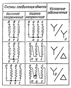 Обмотки высшего и низшего напряжений могут быть соединены в звезду и в треугольник. Соединение обмоток трехфазных трансформаторов в звезду обозначается знаком Y, а в треугольник — Δ; если обмотки соединены в звезду и имеют выведенную нулевую точку, то такое соединение обозначается Y о. На рис. 2 приведены стандартные схемы соединения трехфазных трансформаторов. В третьем столбце приведено условное обозначение схем соединения обмоток трехфазных трансформаторов, где знак над чертой показывает схему соединения обмоток высшего напряжения; знак под чертой - схему соединения обмоток низшего напряжения.