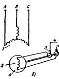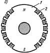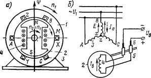 Статор 1 синхронной машины (рис.1, а) выполнен так же, как и асинхронной: на нем расположена трехфазная (в общем случае многофазная) обмотка 3. Обмотку ротора 4, которая питается от источника постоянного тока, называют обмоткой возбуждения (ОВ), так как она создает в машине магнитный поток возбуждения.