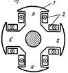 Рис. №3. Конструктивная схема синхронной машины с вращающимся якорем: 1. якорь; 2. обмотка якоря; 3. полюса индуктора; 4. обмотка возбуждения; Синхронная машина может работать автономно в качестве генератора, питающего подключенную к ней нагрузку, или параллельно с сетью, к которой присоединены другие генераторы. При работе параллельно с сетью она может отдавать или потреблять электрическую энергию, т. е. работать генератором или двигателем. При подключении обмотки статора к сети протекающий по обмотке ток создает (так же как в асинхронной машине) вращающееся магнитное поле. В результате взаимодействия этого поля с током Iв протекающим по обмотке ротора, создается электромагнитный момент М, который при работе машины в двигательном режиме является вращающим, а при работе в генераторном режиме - тормозным. Таким образом, в рассматриваемой машине в отличие от асинхронной поток возбуждения (холостого хода) создается обмоткой постоянного тока, расположенной на роторе. Поэтому в установившихся режимах ротор неподвижен относительно магнитного поля и вращается вместе с ним с частотой вращения п1=п2 независимо от механической нагрузки на валу ротора или электрической нагрузки. Таким образом, синхронная машина имеет следующие особенности, характерные для установившихся режимов работы: а) ротор машины, работающей как в двигательном, так и в генераторном режимах, вращается с постоянной частотой, равной частоте вращающегося магнитного поля, т. е. п1=п2; б) частота изменения э.д.с. Е, индуктируемой в обмотке якоря, пропорциональна частоте вращения ротора; в) в обмотке ротора э.д.с. не индуктируется, а ее м.д.с. определяется только током возбуждения и не зависит от режима работы.