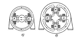 Пропущенный через обмотку возбуждения (электромагнитов) постоянный ток создает магнитный поток полюсов Для лучшего распределения магнитного потока в воздушном зазоре к ярму прикрепляют полюсы с наконечниками, собранные из отдельных стальных листов. В подавляющем большинстве случаев полюс штампуются вместе с полюсным наконечником. На рис. 2 показано схематическое устройство станины с двумя (а) и четырьмя полюсами (б). Внешняя цепь соединяется с цепью якоря машины постоянного тока при помощи щеток, укрепленных в щеткодержателях. Машина постоянного тока в разобранном виде показана на рис. 3.