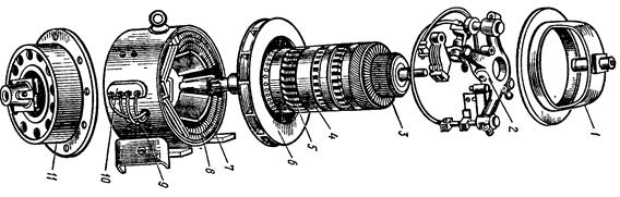 1 — передний подшипниковый щит, 2 — траверса со щеточным аппаратом, 3 — коллектор, 4 — сердечник якоря, 5 — обмотка якоря, 6 — вентилятор, 7 — обмотка полюса, 8 — полюс, 9 — станина, 10 — доска зажимов, 11 — задний подшипниковый щит