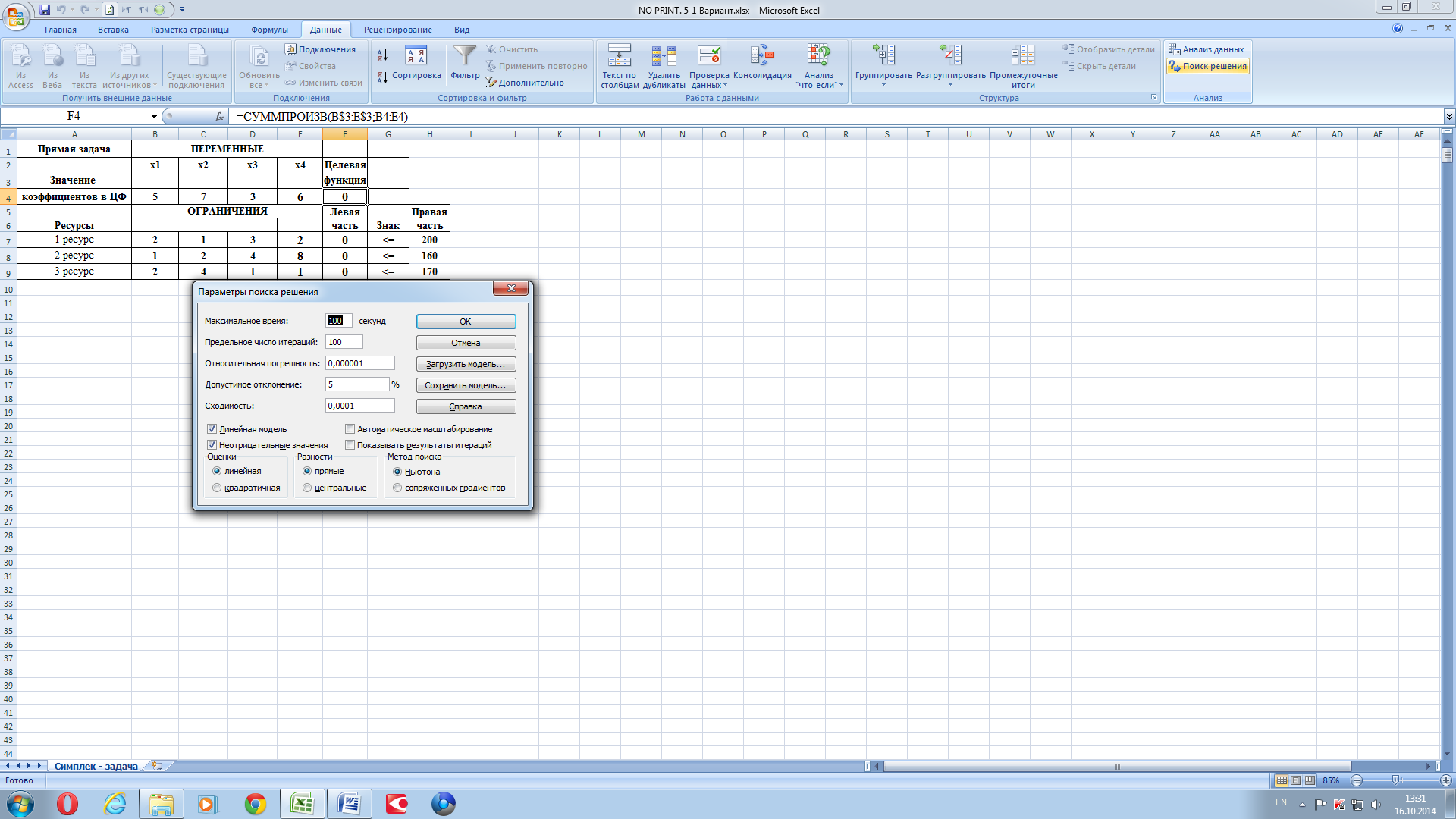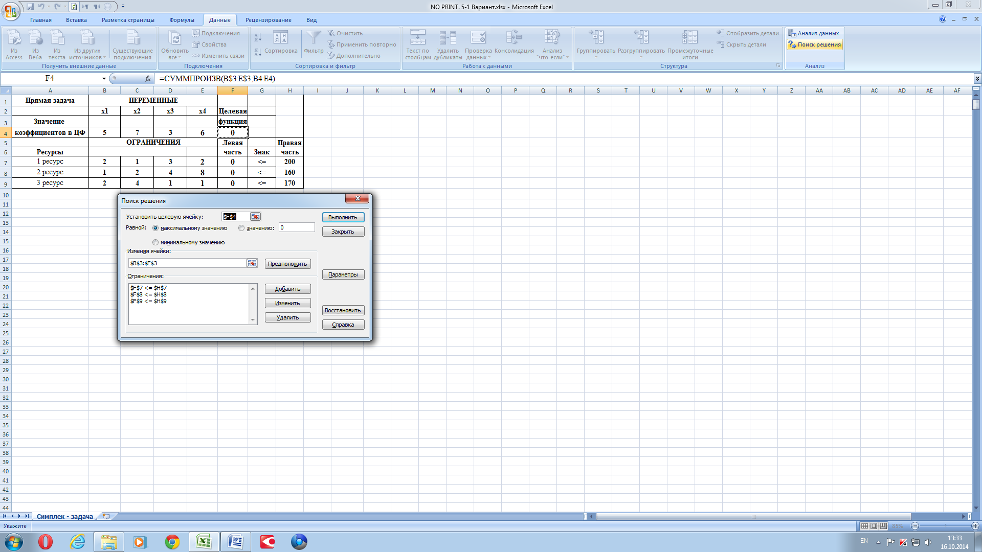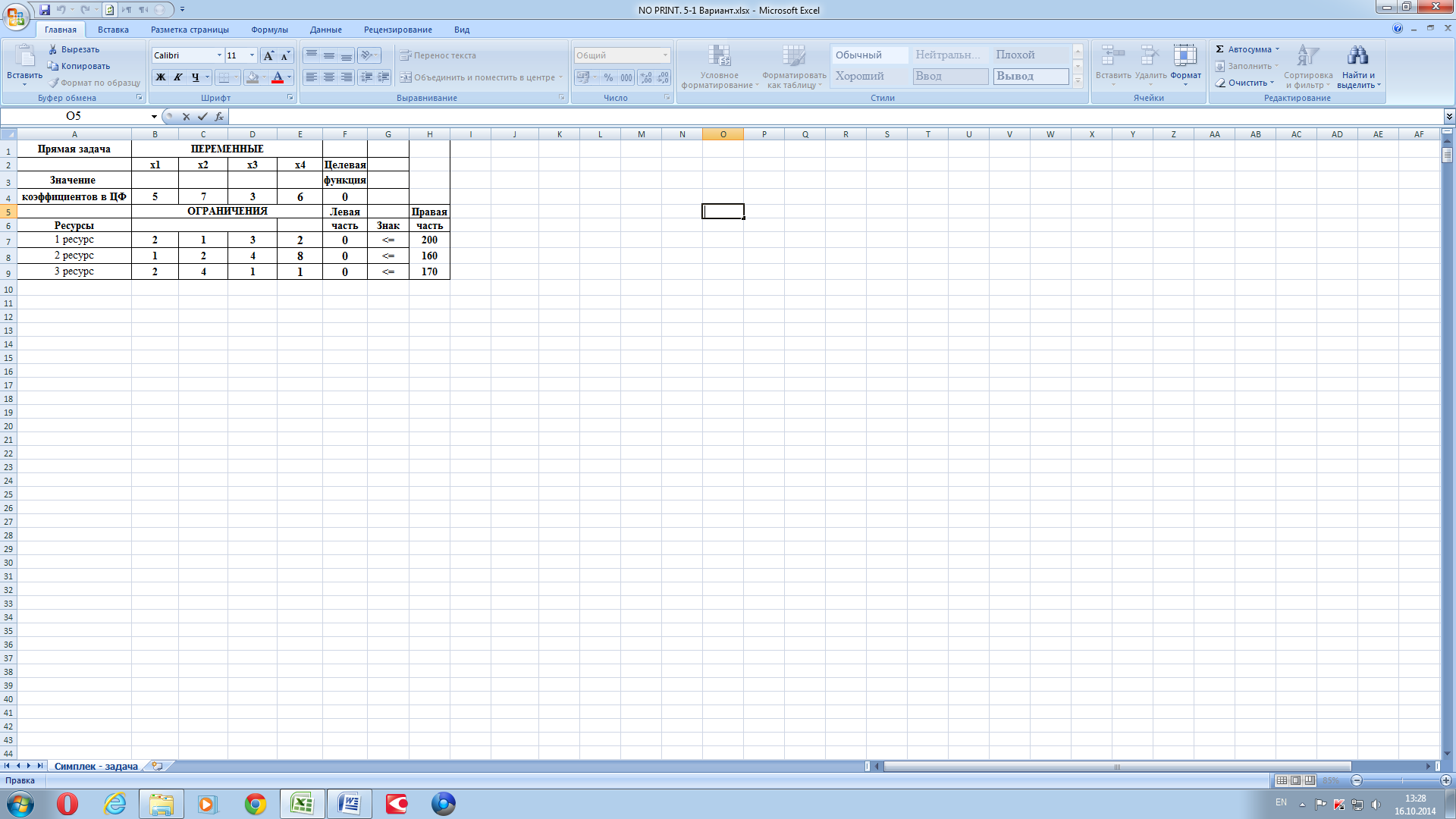 Записи (1), (2) и (3) представляют собой формальный вид прямой задачи линейного программирования на максимум общей прибыли. Открываем книгу «Excel». Задаём имя файла «Excel» – «NO print. Вариант 5». Сохраняем созданный файл, например, «На рабочем столе». Создаём форму и заполняем её для использования встроенной функции Microsoft Office Excel «Поиск решения».
