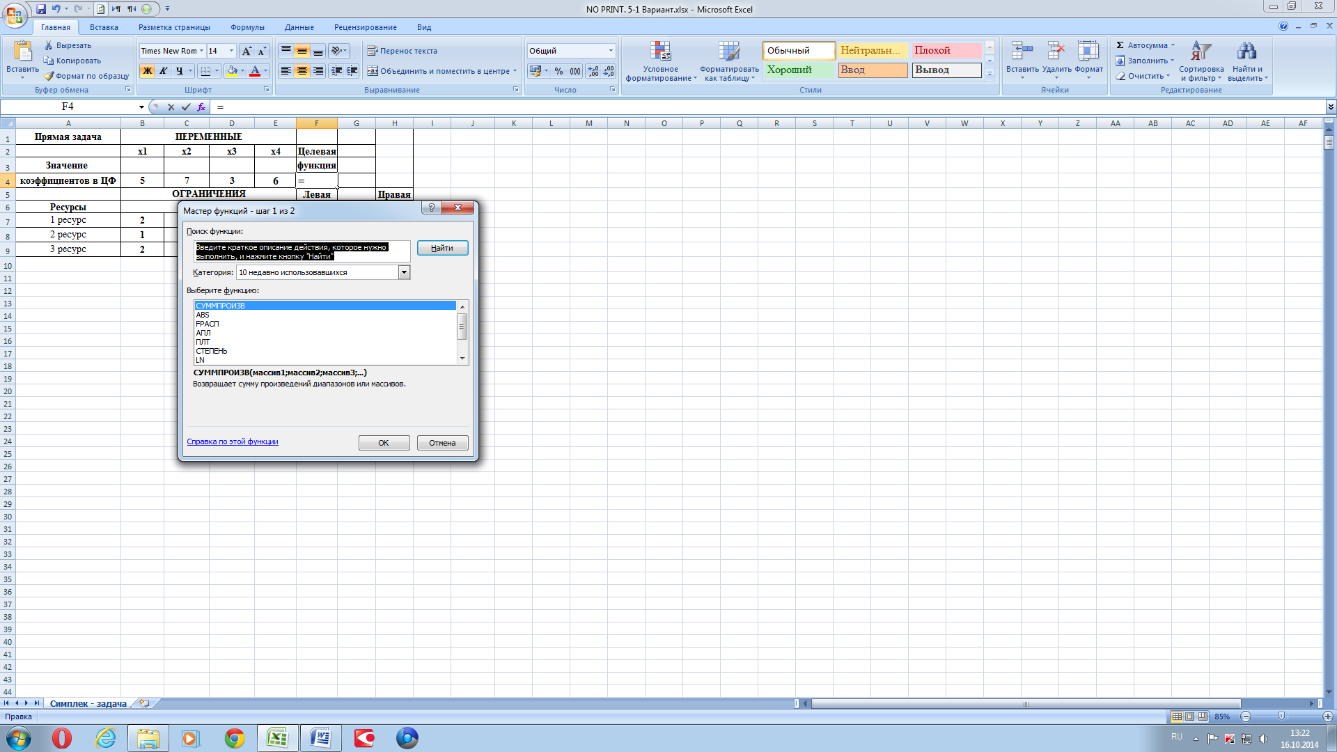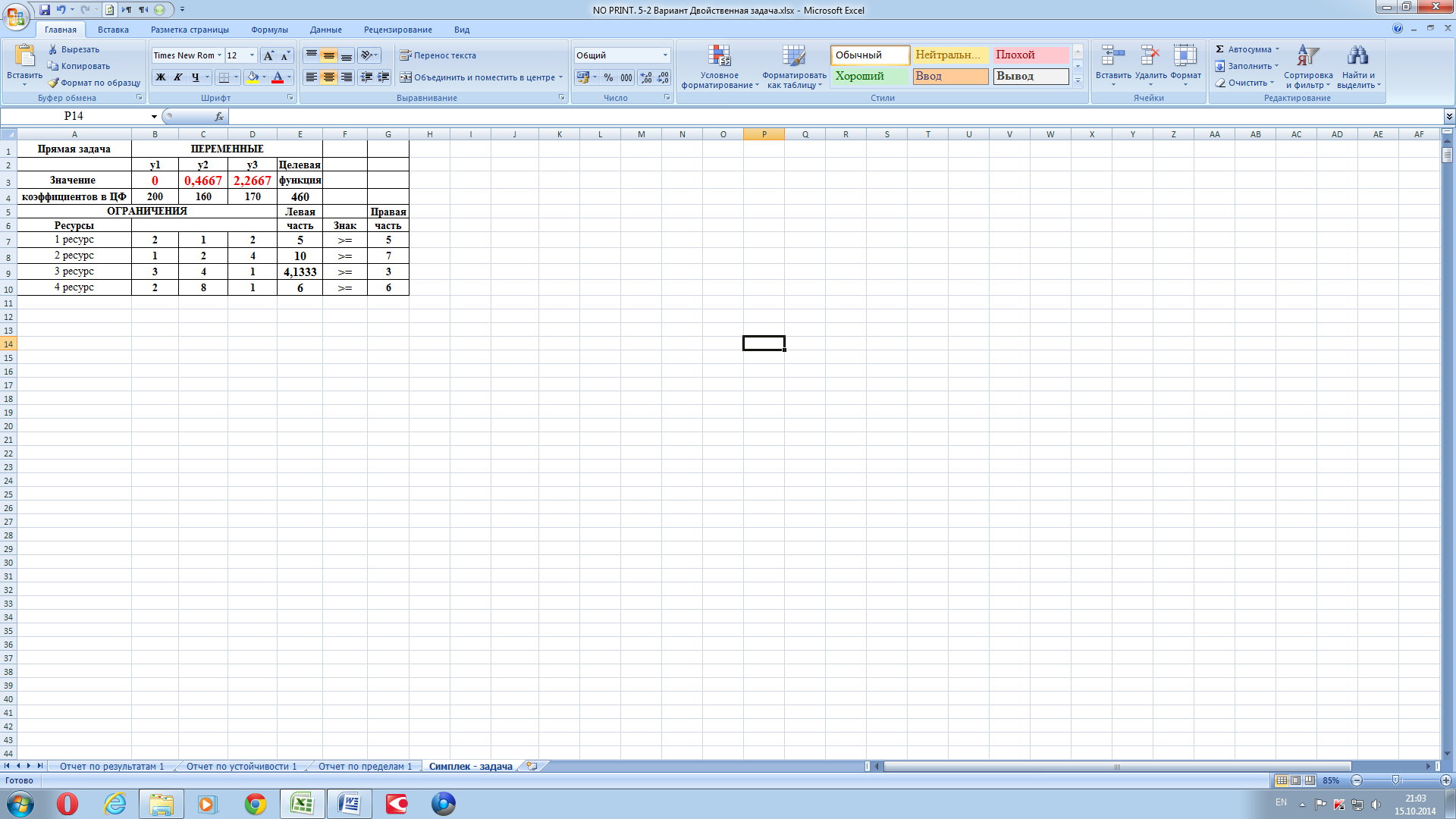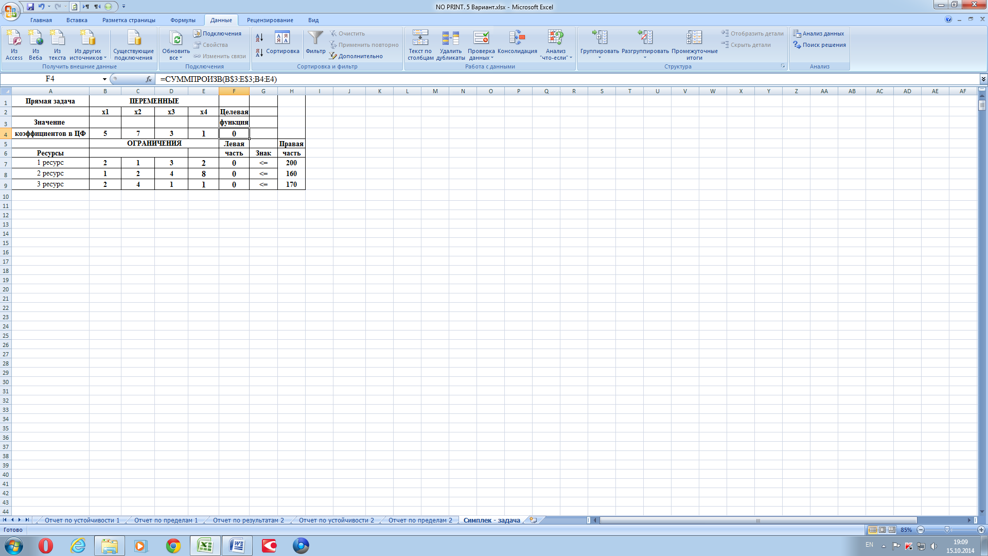 Записи (1), (2) и (3) представляют собой формальный вид прямой задачи линейного программирования на максимум общей прибыли. Открываем книгу «Excel». Задаём имя файла «Excel» – «NO print. Вариант 5». Сохраняем созданный файл, например, «На рабочем столе». Создаём форму и заполняем её для использования встроенной функции Microsoft Office Excel «Поиск решения».