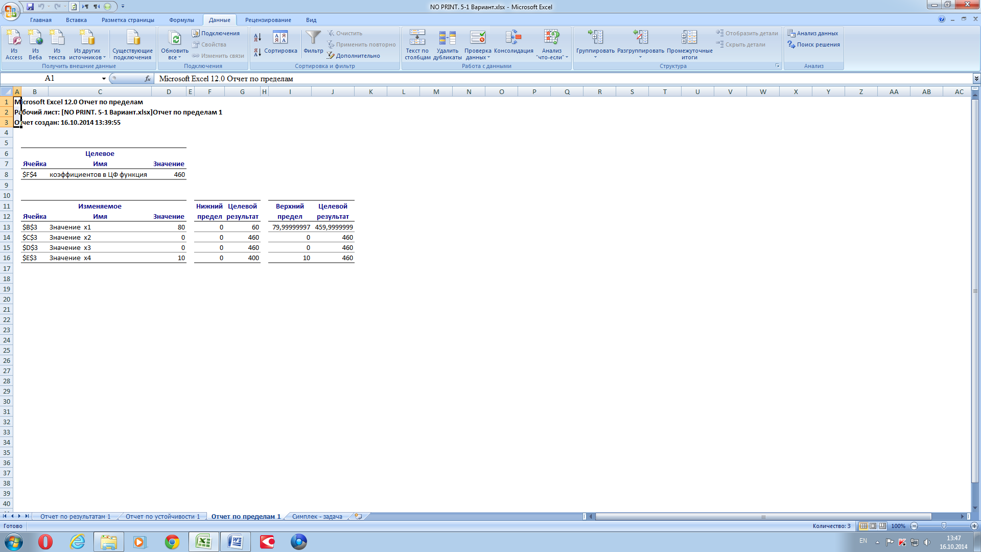 Рисунок 12. Отчёт по пределам. Выводы На основе Отчета по результатам можно сделать следующие выводы об оптимальном решении поставленной задачи: · максимальное значение прибыли от продажи производимых товаров составляет 460 тыс. руб.; · оптимальный план предусматривает производство товаров «А» и «Г» в количестве 80 и 10 шт. соответственно; · ресурсы 2 и 3 типов расходуются полностью, и остается неиспользованным 20 ед. сырья 1 типа. Следовательно, ресурсы 2 и 3 типа являются дефицитными. Согласно Отчету по устойчивости можно сделать следующие выводы: · двойственные оценки (теневые цены) 2 и 3 типов ресурсов положительные. Это еще раз подтверждает, что ресурсы 2 и 3 типа являются дефицитными. Двойственная оценка 1 типа ресурсов показывает, что при его изменении на 8 единиц значение целевой функции не измениться. Следовательно, наиболее предпочтительным (с точки зрения увеличения запаса ресурсов) из дефицитных ресурсов является ресурс 3 типа, поскольку его изменение обеспечивает наибольший прирост целевой функции.