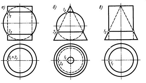 Рисунок 6.16 6.8.2 Перетин поверхонь, що мають спільну вісь обертання Дві поверхні обертання називаються співвісними, якщо вони мають спільну вісь обертання. Якщо центр сфери лежить на осі обертання будь якої поверхні, така пара поверхонь також називається співвісною. Дві співвісні поверхні завжди перетинаються по колу (рис. 6.17). Якщо сфера перетинається з будь-якою поверхнею обертання і центр сфери знаходиться на осі обертання цієї поверхні, то лінією перетину цих поверхонь є коло. У перетині утворюється стільки кіл, скільки разів обрис сфери перетинається з обрисом поверхні обертання. Якщо вісь поверхні обертання паралельна або перпендикулярна до неї, то ці кола проекціюються (відображаються) на площину проекцій як прямі лінії.
