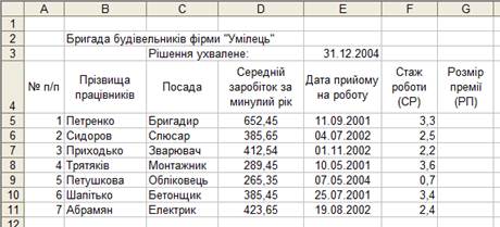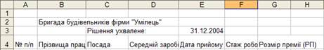 і реалізувати таку модель в середовищі табличного процесора MS Excel. Моделювання розрахункової таблиці в середовищі MS Excel. 1). Створення таблиці. a. Вводимо початкові дані: - Заголовок таблиці в осередок В2; - Текст «Рішення ухвалене»: в осередок С3 і безпосередньо дату в Е3 ( При введенні Дати у форматі ДД.ММ.ГГ використовують дефіс або крапку, як роздільник.). b. Створюємо «шапку» таблиці (текстові дані для іменування стовпців): - «№ п/п» в осередок А4; - «Прізвища працівників» в осередок В4; - «Посада» в осередок С4; - «Середній заробіток за минулий рік» в осередок D4; - «Дату прийому на роботу» в осередок Е4; - «Стаж роботи (СР)» в осередок F4; - «Розмір премії (РП )» в осередок G4.