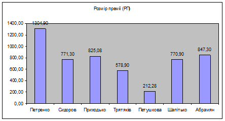 Побудова діаграми. Побудуємо діаграму, по якій можна наглядно оцінити Розмір премії для кожного працівника. Для цього необхідно: - виділити діапазони В4:B11 і G4:G11 (виділення проводиться при натиснутій клавіші Ctrl); - Визвати Майстра діаграми кнопкою