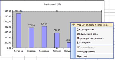 Доформатуємо отриману діаграму. А саме приберемо сіру заливку області побудови діаграми. Для цього виділимо Область построения и визвемо контекстне меню правою клавішею миші. Виберемо пункт Формат области построения…: