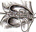 2. Между держалками с интервалом 0,3-0,4 см накладывают узловые серозно-мышечные швы Ламбера. 3. Мягкие зажимы снимают, заднюю губу анастомоза прошивают кетгутовым непрерывным сквозным швом с захлесткой (швом Мультановского). 4. Этой же нитью переходят на переднюю губу анастомоза и ушивают ее сквозным швов Шмидена. Нить завязывают. 5. Меняют перчатки, салфетки, обрабатывают шов и ушивают переднюю губу анастомоза узловыми серозно-мышечными швами Ламбера. Проверяют проходимость анастомоза.