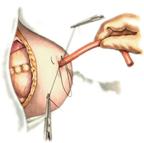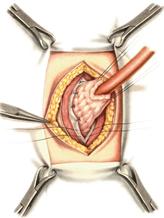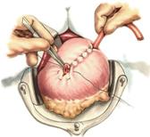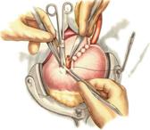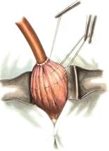 б. Переднюю стенку желудка выводят в рану в виде конуса. в. На переднюю стенку желудка накладывают три концентрических кисетных шва с интервалом 1,0-1,5 см один ниже другого. г. В центре первого кисетного шва стенку желудка вскрывают и в его просвет вводят резиновую трубку. Вокруг нее завязывают первый кисетный шов таким образом, чтобы край желудочной стенки инвагинировался в просвет желудка. Так же затягивают второй и третий кисетный шов, одновременно погружая трубку со стенкой желудка вглубь, чтобы образовался цилиндр, обращенный в просвет желудка. д. Стенку желудка вокруг трубки подшивают к брюшине для герметизации щели между трубкой и желудком. е. Рану брюшной стенки послойно ушивают до трубки. Образуется трубчатый свищ, который после удаления трубки заживает самостоятельно. 3. способ Топровера: