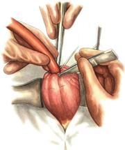 а. Доступ: трансректальный разрез слева длиной 6-8 см или верхняя срединная лапаротомия. б. В рану извлекают переднюю стенку желудка в виде конуса и поочередно, как при способе Кадера, накладывают три кисетных концентрических шва один ниже другого. в. В центре первого кисетного шва желудок вскрывают на протяжении 1 см и вводят внутрь резиновую трубку. На трубке кисетные швы завязывают. г. Образованный из желудочной стенки конус подшивают на уровне нижнего кисетного шва к париетальной брюшине. д. Рану передней брюшной стенки ушивают послойно. е. На уровне второго кисетного шва стенку желудка подшивают к прямой мышце живота, а вблизи трубки – к коже. ж. Образуется губчатый свищ на длительное время. Данный свищ может быть закрыт только оперативным путем.