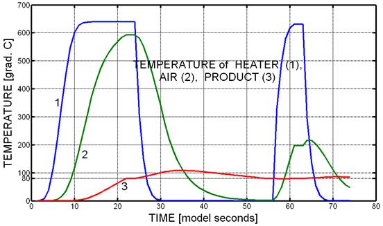 Графики переходных процессов на рисунке 9 показывают частое включение и отключение в заданных пределах (1000-4000) быстро работающего нагревателя, медленный разогрев воздуха до равновесной температуры (около 2400), и совсем медленный разогрев продукта до 800. При достижении продуктом заданных 800 сначала отключается плитка и вслед за её остыванием начинает остывать и воздух. Температура продукта недолго повышается, пока воздух в процессе охлаждения ещё остаётся горячее 800, а затем тоже начинает охлаждаться.