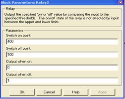 Рисунок 7 – Диалоговое окно настройки блока реле, которое в ответ на любой положительный входной сигнал отвечает выходным сигналом, равным единице. Если входной сигнал меньше нуля, выходной сигнал равен нулю.