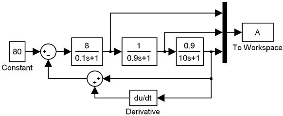 Рисунок 11 – Модель САР с двухпозиционным PD-регулятором и графики температур. В цепи обратной связи установлен сумматор для суммирования двух сигналов: величины самой температуры и её скорости. Этот увеличенный суммарный сигнал приводит к раннему отключению плитки, чтобы не произошло пускового выброса температуры всех звеньев системы. Графики температур показаны на рисунке 12.