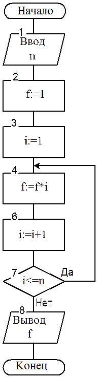 Циклическим алгоритмом называется такой алгоритм, в котором можно выделить многократно повторяющуюся последовательность предписаний, называемую циклом. Для таких алгоритмов характерно наличие параметра цикла, которое перед входом в цикл имеет начальное значение, а затем изменяется внутри цикла. Имеется также предписание о проверке условия окончания цикла. Применение циклов сокращает текст алгоритма и, в конечном итоге, длину программы. Примером циклического алгоритма может служить алгоритм, приведенный на рис.4 и определяющий факториал натурального числа n. В этом алгоритме введена дополнительная переменная i, которая является параметром цикла и изменяется от начального значения 1 до конечного значения n c шагом 1. На каждом шаге итерации искомая величина f умножается на переменную цикла. В реальных задачах, как правило, сочетаются все три типа алгоритмов. Способ описания алгоритма с помощью алгоритмического языка подробно рассматривается в следующем разделе.
