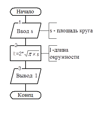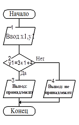По своей структуре различают следующие типы алгоритмов: линейные, разветвляющиеся и циклические. В линейных схемах алгоритмов все предписания выполняются одно за другим. Например, алгоритм вычисления длины окружности по известной площади круга (рис.2). В разветвляющихся схемах алгоритмов для конкретных исходных данных выполняются не все заданные предписания. Однако какие именно предписания будут выполняться, конкретно определяется в процессе выполнения алгоритма в результате проверки некоторых условий. Разветвляющийся алгоритм всегда избыточен. Примером разветвляющегося алгоритма является алгоритм, приведенный на рис.3 и определяющий, пройдет ли график функции y=3x+4 через точку с координатами x1,y1.