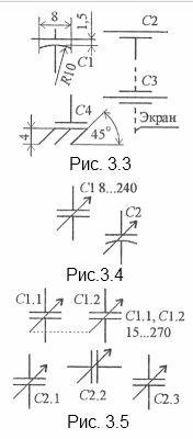 Номинальное напряжение конденсаторов (кроме так называемых оксидных) на схемах, как правило, не указывают. Только в некоторых случаях, например, в схемах цепей высокого напряжения рядом с обозначением номинальной ёмкости можно указывать и номинальное напряжение (см. рис. 3.1, С4). Для оксидных же конденсаторов (старое название электролитические) и особенно на принципиальных схемах бытовых электронных устройств это давно стало практически обязательным (рис. 3.2). Подавляющее большинство оксидных конденсаторов — полярные, поэтому включать их в электрическую цепь можно только с соблюдением полярности. Чтобы показать это на схеме, у символа положительной обкладки такого конденсатора ставят знак «+», Обозначение С1 на рис. 3.2 — общее обозначение поляризованного конденсатора. Иногда используется.другое изображение обкладок конденсатора (см. рис.3.2, С2 и СЗ). С технологическими целями или при необходимости уменьшения габаритов в некоторых случаях в один корпус помещают два конденсатора, но выводов делают только три (один из них общий). Условное графическое обозначение Для развязки цепей питания высокочастотных устройств по переменному току применяют так называемые проходные конденсаторы. У них тоже три вывода: два — от одной обкладки («вход» и «выход»), а третий (чаще в виде винта) — от другой, наружной, которую соединяют с экраном или завёртывают в шасси. Эту особенность конструкции отражает условное графическое обозначение такого конденсатора (рис. 3.3, С1). Наружную обкладку обозначают короткой дугой, а также одним (С2) или двумя (СЗ) отрезками прямых линий с выводами от середины. Условное графическое обозначение с позиционным обозначением СЗ используют при изображении проходного конденсатора в стенке экрана. С той же целью, что и проходные, применяют опорные конденсаторы. Обкладку, соединяемую с корпусом (шасси), выделяют в обозначении такого конденсатора тремя наклонными линиями, символизирующими «заземление» (см. рис. 3.3, С4).