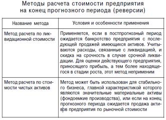 Методы оценки недвижимости в рамках оценки бизнеса. 22. Расчет определения денежного потока в постпрогнозный период: модель Гордона. При эффективном управлении предприятием срок его жизни стремится к бесконечности. Прогнозировать на несколько десятков или сотен лет вперед нецелесообразно, так как чем дольше период прогнозирования, тем ниже точность прогноза. Чтобы учесть доходы, которые может принести бизнес за пределами периода прогнозирования, определяется стоимость реверсии. Реверсия — это: — доход от возможной перепродажи имущества (предприятия) в конце периода прогнозирования; — стоимость имущества (предприятия) на конец прогнозного периода. В зависимости от перспектив развития бизнеса в постпрогнозный период выбирается один из представленных в табл. 4.6 способов расчета его стоимости на конец прогнозного периода.
